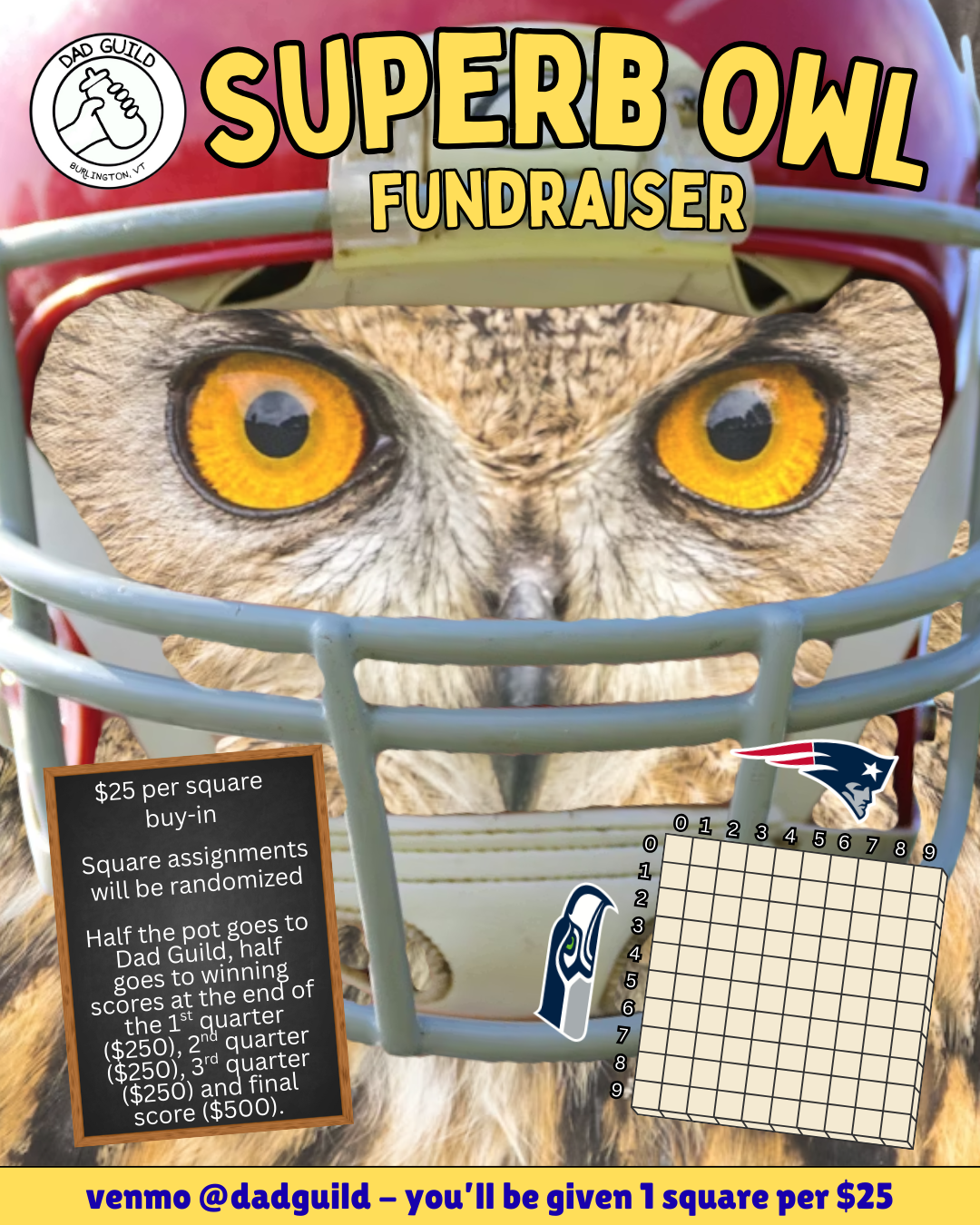How it works: We’ll be using the 10x10 grid format, with the numbers 0-9 along the horizontal (Patriots) and vertical (Seahawks) axes. Anyone can purchase a square for $25, which will be randomly assigned prior to the Superb Owl. If the numbers of your square match up with the ones place of the score at the end of a quarter, win a cash prize!